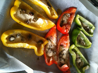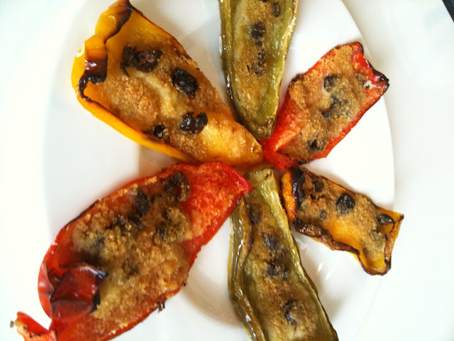 Disponete i quarti di peperone su di una teglia coperta di carta forno e riempiteli con qualche cucchiaio di pangrattato, le olive e i capperi tagliati a pezzetti, salate e versate sopra ad ogni peperone dell’olio a filo ( non troppo se non diventano troppo pesanti) e qualche goccia di acqua in modo da renderli un po’ umidi ed evitare che brucino subito