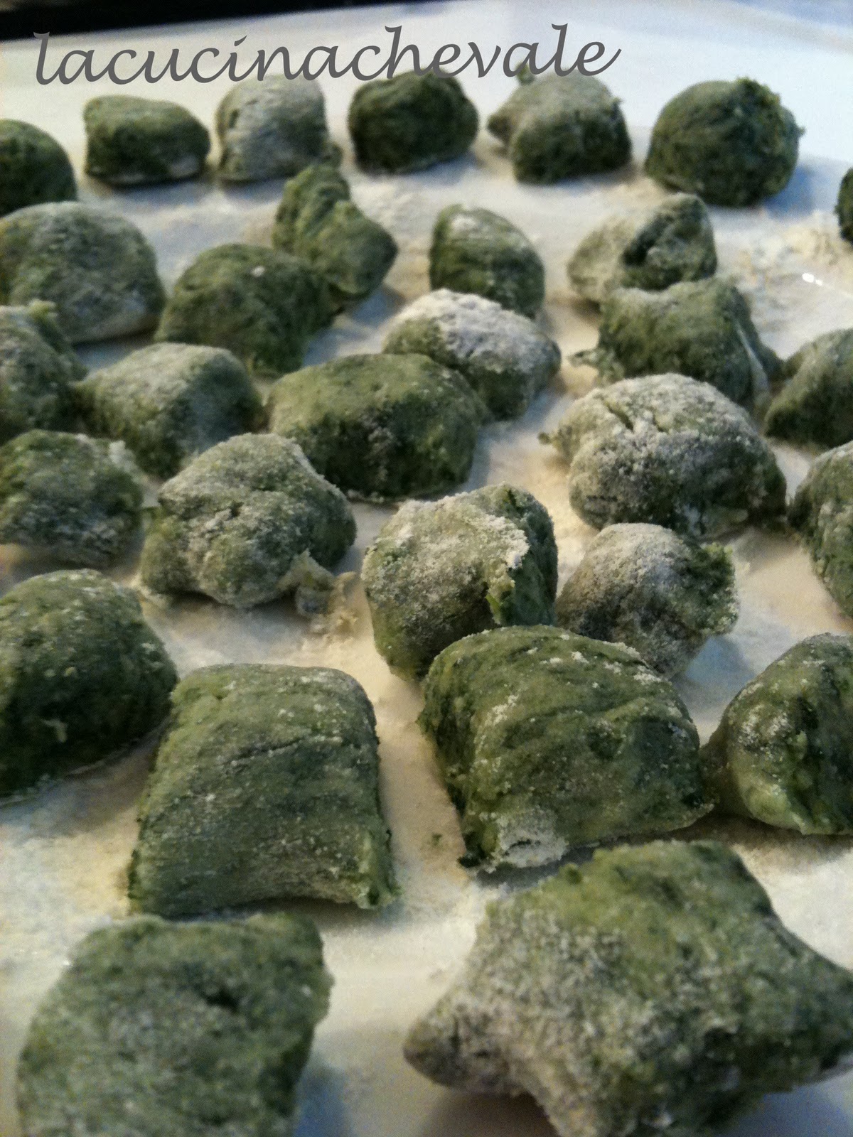 Prendete poco impasto alla volta e sul piano infarinato formate dei cilindri che poi taglierete a pezzetti, formando i vostri gnocchi. Metteteli in un vassoio infarinato per evitare che si attacchino (io uso i piatti di portata). In questa ricetta lascio gli gnocchi così come vengono senza “ricamarli” con la grattuggia o con la forchetta.