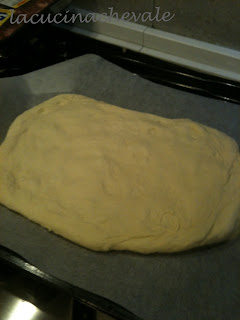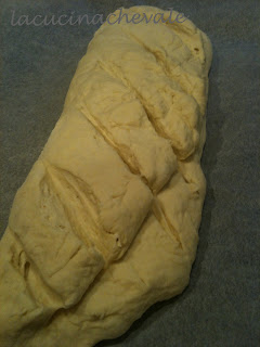 Passato questo tempo, schiacciate la pasta senza impastarla, stendetela con le mani ad uno spessore di 3-4 centimetri, in modo da darle la forma di un rettangolo, e arrotolatela poi su se stessa dal lato lungo. Io lo faccio direttamente sulla leccarda ricoperta di carta forno e spolverizzata di farina. Con un coltello bene affilato, dei tagli obliqui sulla superficie, spolverizzate abbondantemente di farina e lasciare riposare ancora 30 minuti. |
