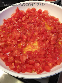 Pulite i pomodorini e tagliateli a pezzetti (se volete eliminare la pelle li dovete prima scottare in acqua bollente, ma ovviamente i tempi si allungano un pochino) e metteteli in una padella con 3 cucchiai di olio.