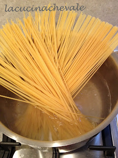 Buttate gli spaghetti nell’acqua bollente salata, interi e spingeteli piano piano giù in modo da ricoprirli con l’acqua, aggiungete un filo d’olio per evitare che si appiccichino.