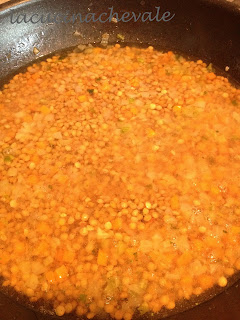 Affettate sottilmente il sedano, la carota e la cipolla, (non avendo in casa il sedano ho optato per il preparato per soffritto surgelato, ma preferite sempre le verdure fresche!) e la pancetta o speck e fate soffriggere, aggiungete le lenticchie precedentemente lavate e acqua sufficiente a coprirle. Fate cuocere per circa 50/60 minuti a fuoco basso controllando sempre che non asciughino troppo e aggiungete quindi altra acqua, regolate di sale.