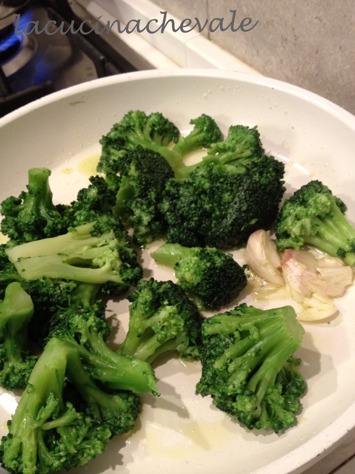 Schiacciate 1 spicchio d’aglio con la buccia e fatelo scaldare in 3 cucchiai di olio, aggiungete i broccoli e fate insaporire regolando si sale.