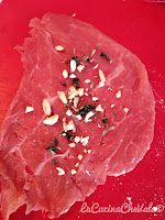Condite le fettine di carne con le erbe aromatiche, (l’aglio tritato), il pecorino e i pinoli. Salate.