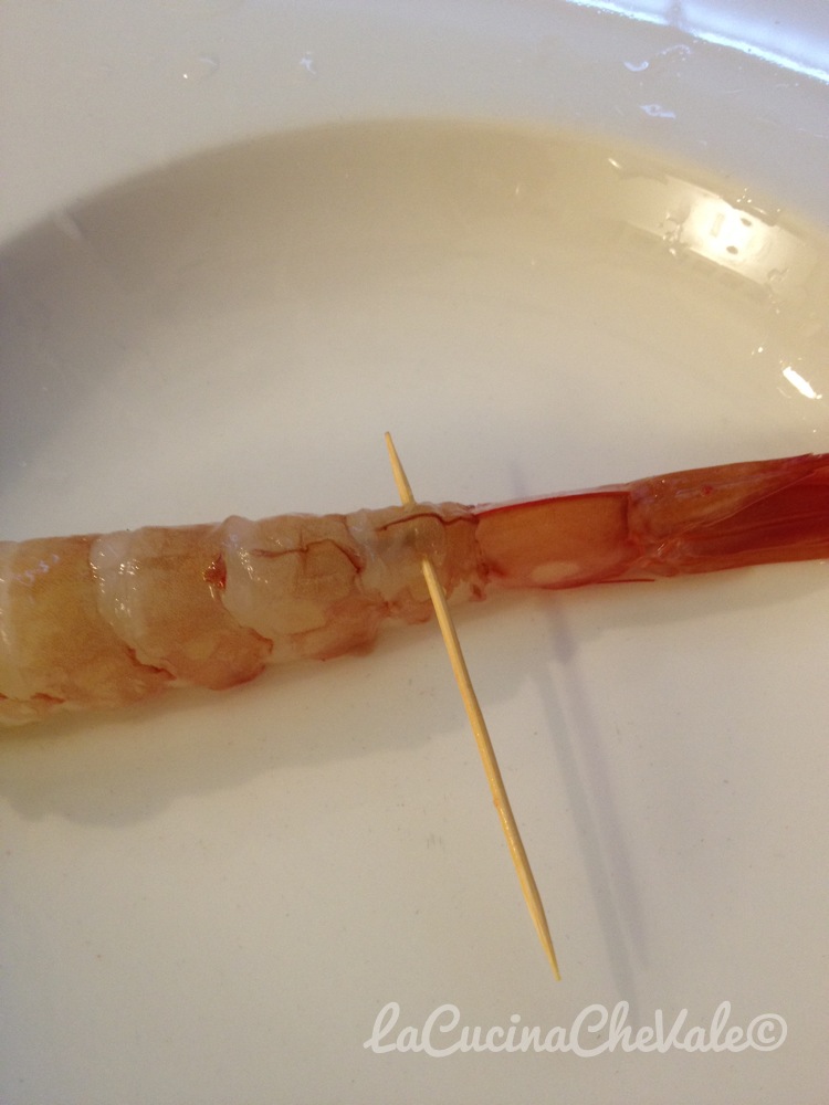 Pulite i gamberi eliminado la testa e il carapace (il guscio) e lasciando solo l’ultimo pezzettino con la coda. Eliminate il filetto interno contenente le budella infilando uno stuzzicadenti nella parte del gambero vicina alla coda e sfilatelo tirando verso la coda, in questo modo non rovinerete il gambero con una incisione e il filetto verrà via benissimo senza rompersi.