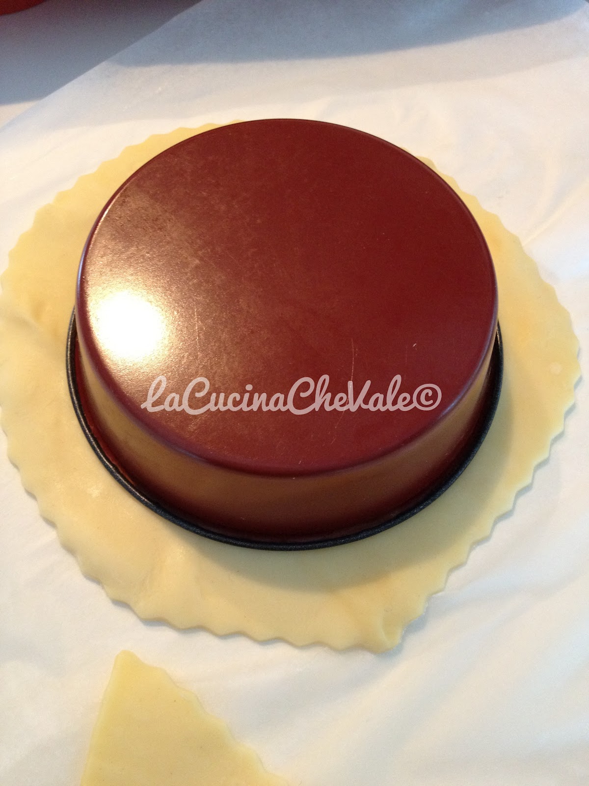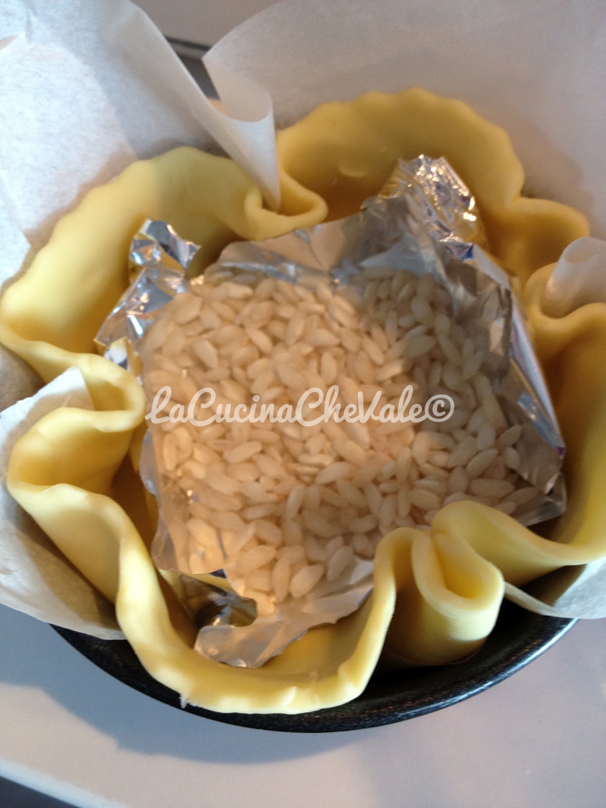 Con la pasta sfoglia tagliate dei cerchi poco più grandi dello stampino che userete per la cottura e rivestite lo stampino di carta forno, mettete la pasta sfoglia. Per evitare che la sfoglia in cottura si gonfi sul fondo mettete dell’alluminio e dei fagioli o del riso.