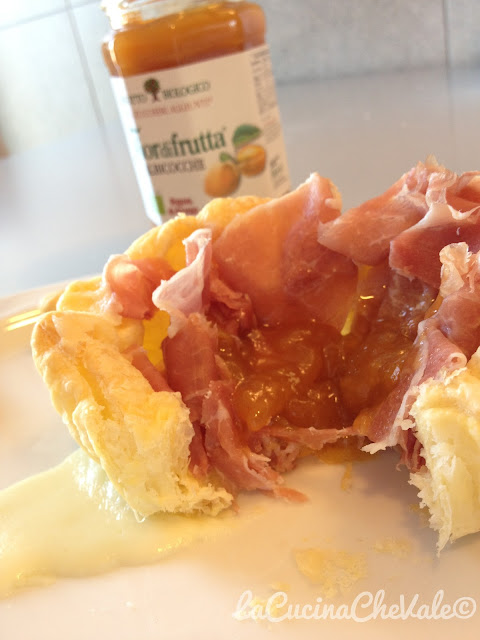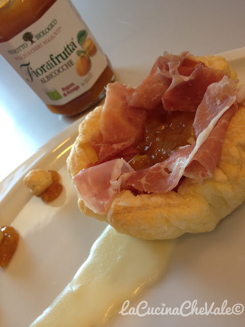 LA TORTINA, IL PROSCIUTTO CRUDO, LA CREMA DI TALEGGIO CALDA E LA MARMELLATA DI ALBICOCCHE