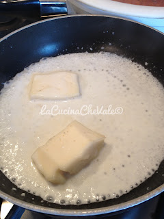 Fate raffreddare e nel frattempo preparate la crema di taleggio facendo sciogliere il taleggio con un goccio di latte fino anche non diventi cremoso.
