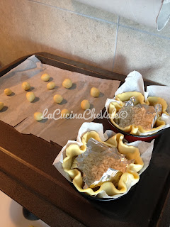 Con la pasta sfoglia avanzata fate delle palline che serviranno da decorazione. Cuocete le tortine e le palline in forno caldo a 180 per 15 / 20 minuti o fino a quando la sfoglia sarà appena dorata.