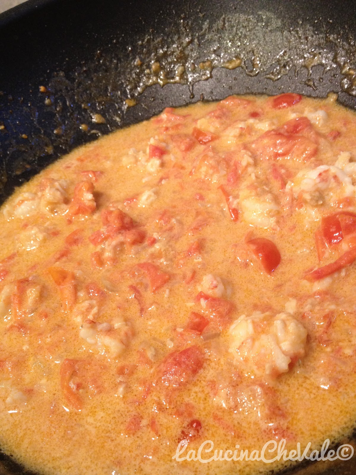 Aggiungete gli scampi e i due cucchiai di panna e fate cuocere ancora per 3/4 minuti, gli scampi non devono stracuocere se no diventano gommosi.