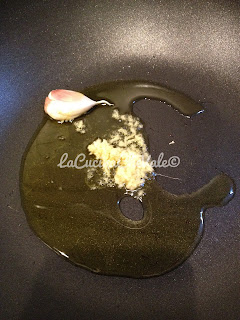 Pelate la radice di zenzero e grattugiatela, mettete il succo e la polpa in una wok con 1 spicchio d’aglio in camicia e 4 cucchiai di olio e fate scaldare qualche minuto.