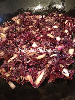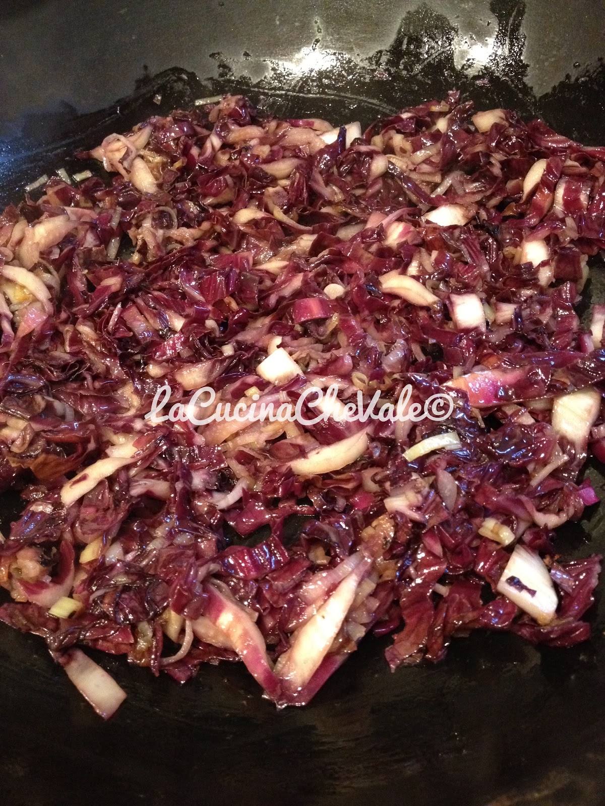Affettate lo scalogno e fatelo soffriggere appena con 5 cucchiai di olio, aggiungete il radicchio lavato e tagliato a fettine sottili e fatelo appassire cuocendo per almeno 5 minuti.