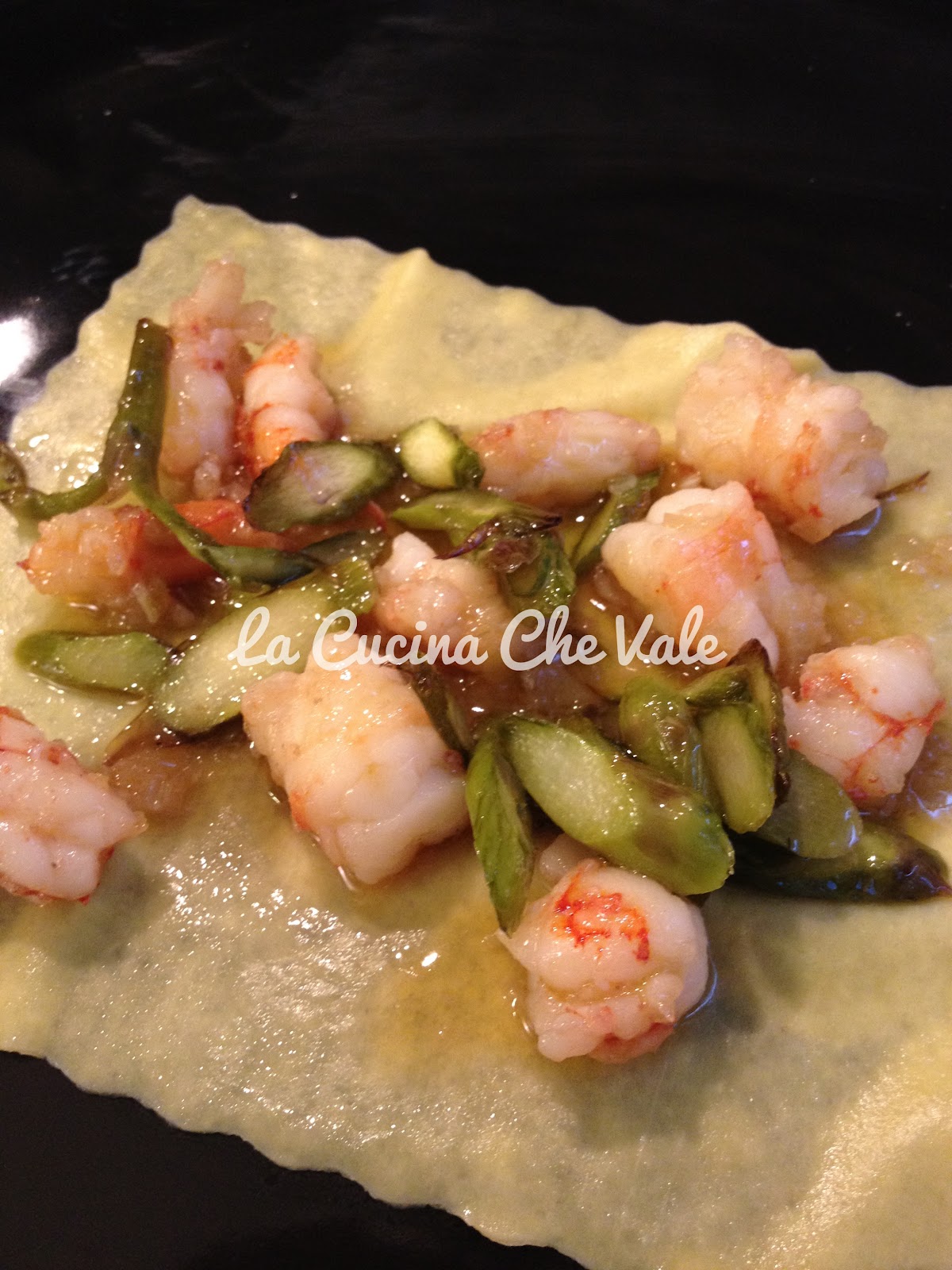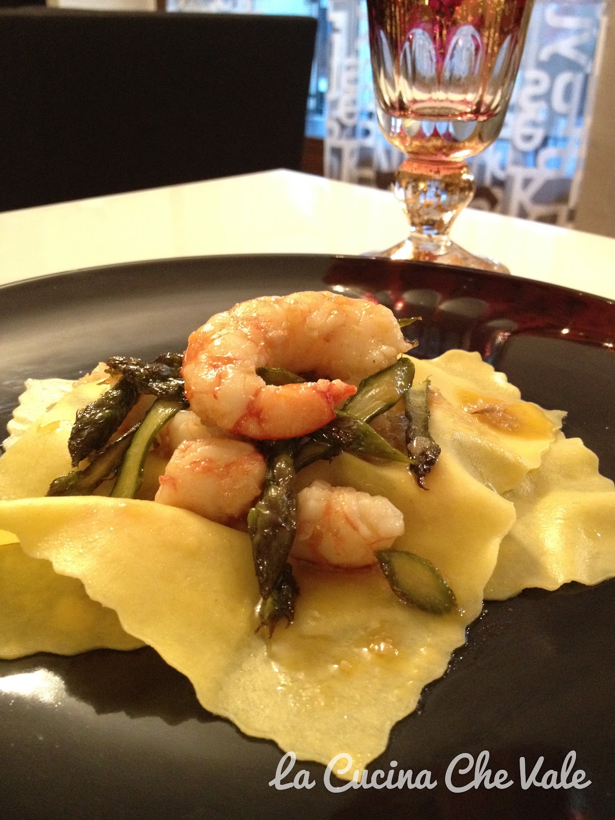 IL RAVIOLO APERTO CON GAMBERI AL MIRTO E ASPARAGI SALTATI
