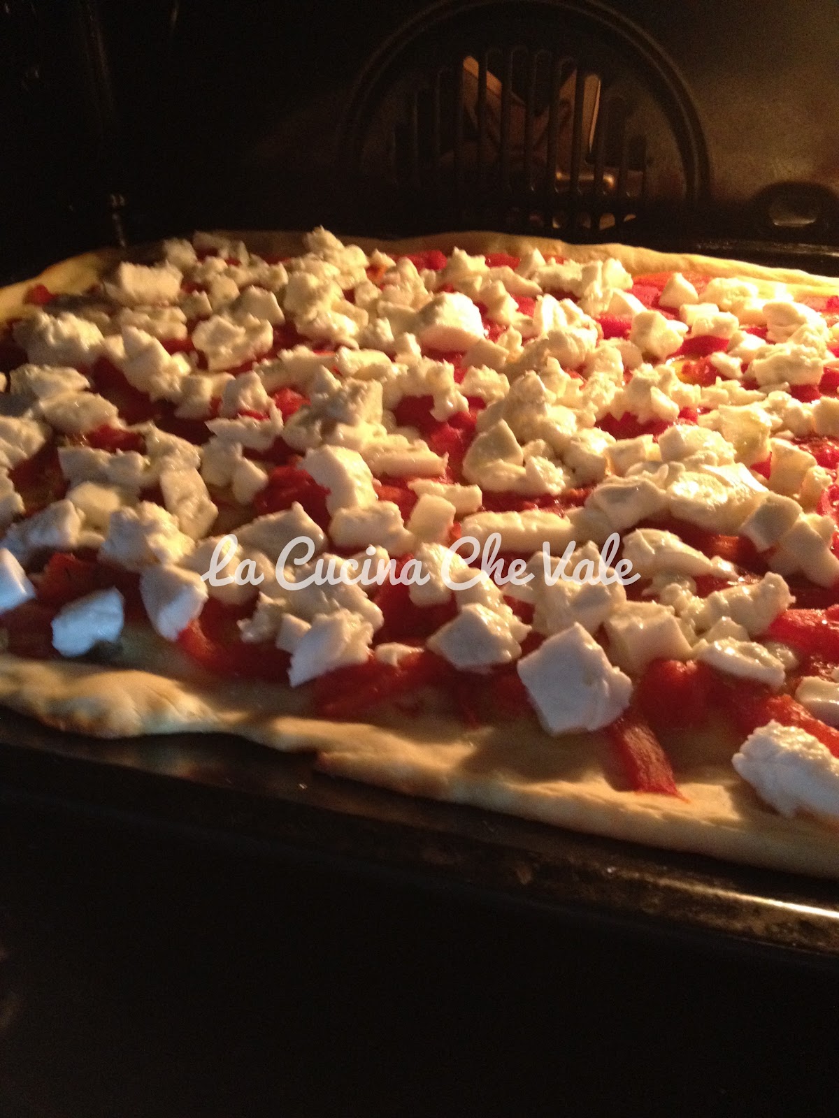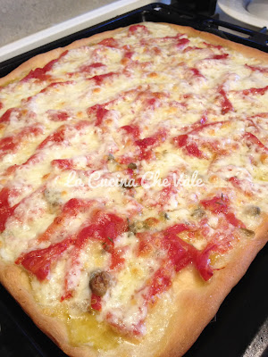 Lascio lievitare ancora 1 ora, preriscaldo il forno a 220 gradi, condite con il pomodoro e infornate per 10 minuti. Togliete dal forno, aggiungete sale, olio e mozzarella e cuocete ancora per altri 10 minuti.