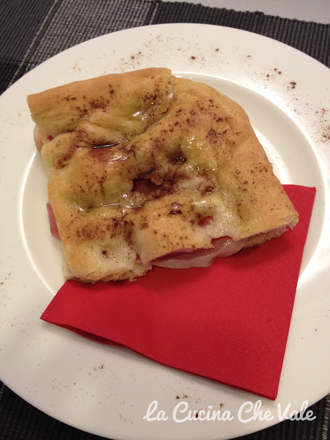 Quando la focaccia è cotta tagliatela ancora calda e farcitela con 1 cucchiaio di gorgonzola dolce, 1/2 pomodoro tagliato a fette, 1 fetta di prosciutto crudo, un filo d’olio, chiudete e spolverate abbondantemente con la cannella.