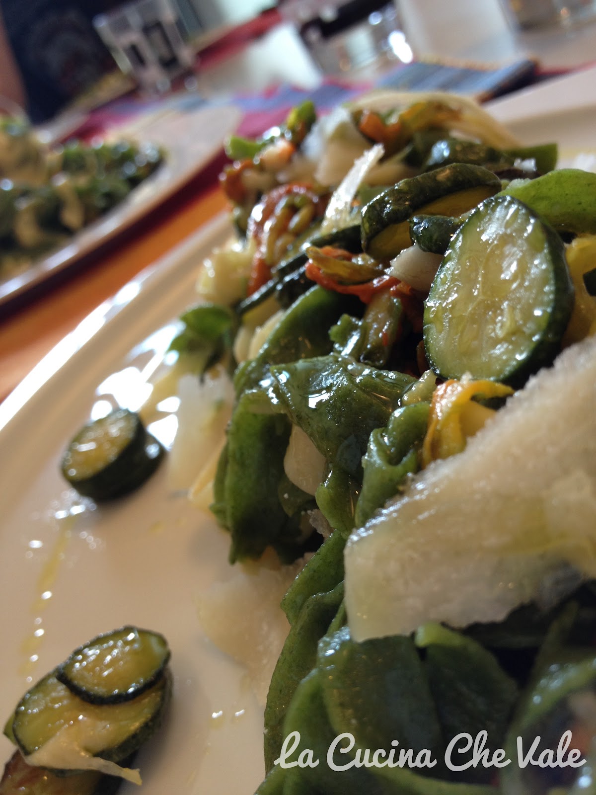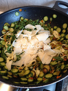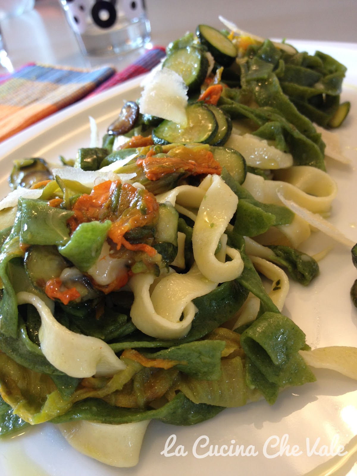 LE TAGLIATELLE PAGLIA E FIENO CON ZUCCHINETTE E FIORI E SCAGLIE DI PARMIGIANO