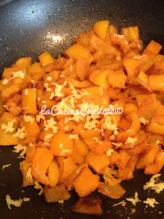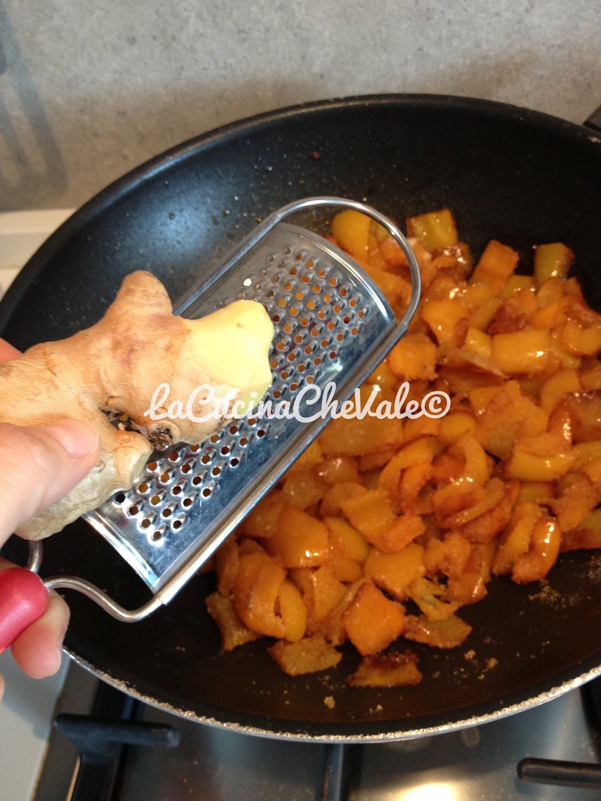 Pulite i peperoni e tagliateli a quadratini, metteteli a cuocere in una padella con 3 cucchiai di olio per circa 15 minuti, a fine cottura salate e aggiungete un pezzettino di zenzero grattugiato.
