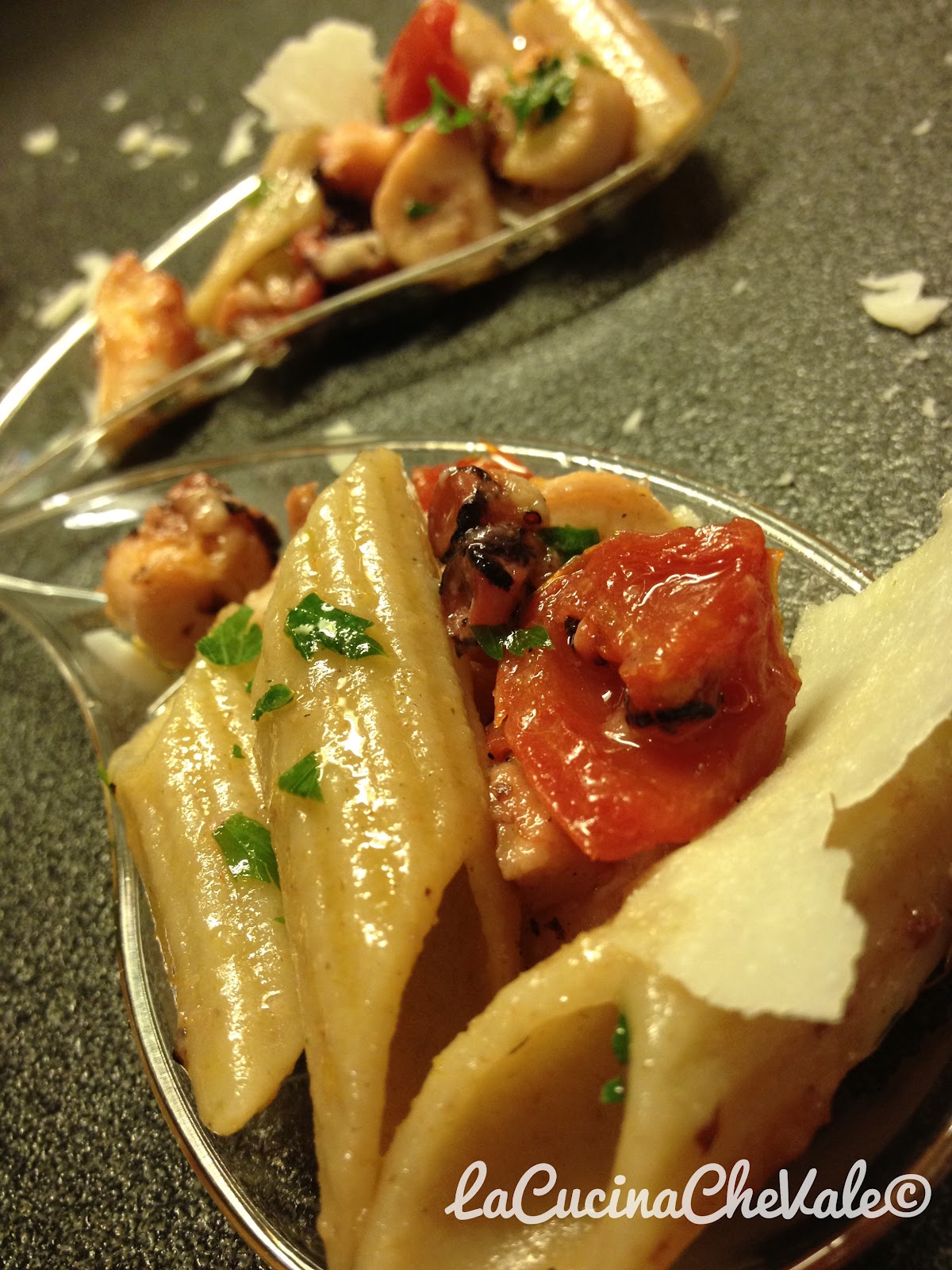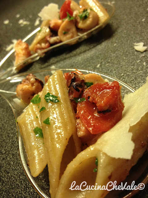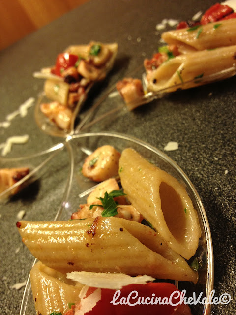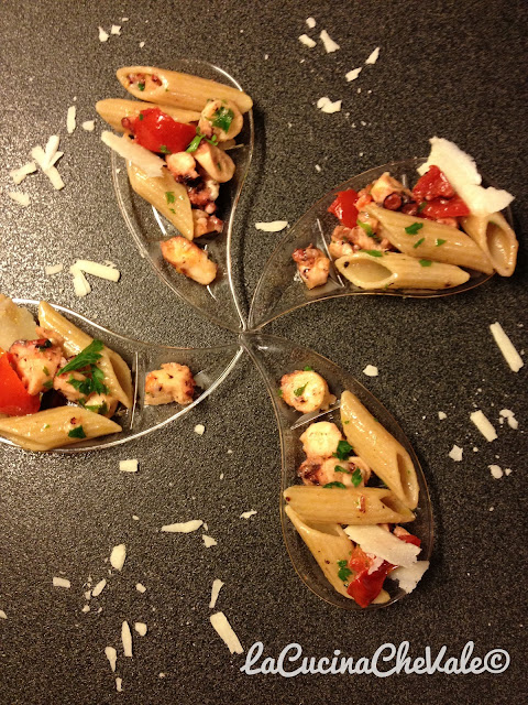 Per il contest di Atmosfera Italiana ho preparato questa deliziosa ricetta grazie ai consigli della mia amica romana che incontro ogni anno al mare. Non avevo mai provato prima d’ora la pasta con il polpo ed è stata una piacevole scoperta. Niente di più facile, leggero e davvero gustoso e poi il pecorino romano si sposa perfettamente con il polpo. Devo ringraziare anche Benedetto Cavaliere per aver creato la pasta integrale più buona del mondo e come sempre ho messo a tacere gli scettici per aver abbinato la pasta integrale con il pesce. Anche questa volta la presentazione è in accessori da finger food