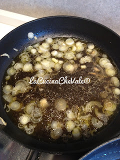 Tagliate a rondelle i cipollotti e fateli stufare con olio e acqua per 5 minuti. Aggiungete poi ai cipollotti il tè affumicato filtrato e lasciate che si insaporiscano bene per altri 5 minuti lasciandoli un po’ brodosi, salate appena.