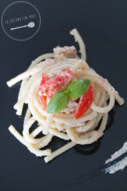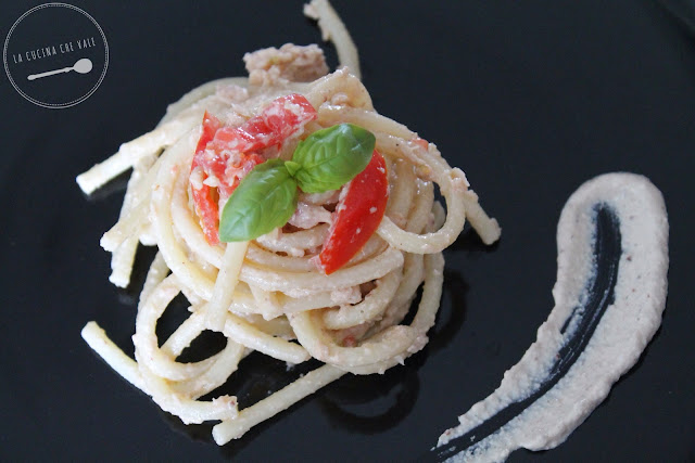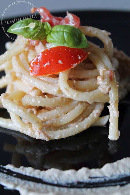 BUCATINI IN CREMA DI SEMI OLEOSI, TONNO, POMODORINI E BASILICO