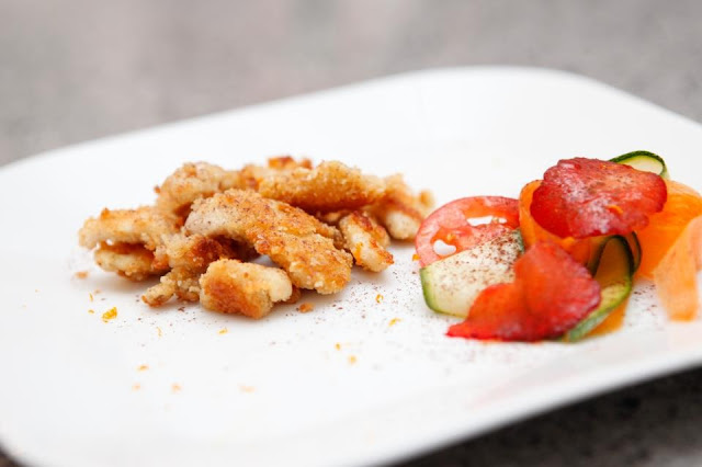POLLO CROCCANTE CON CACAO E INSALATINA DI FRAGOLE