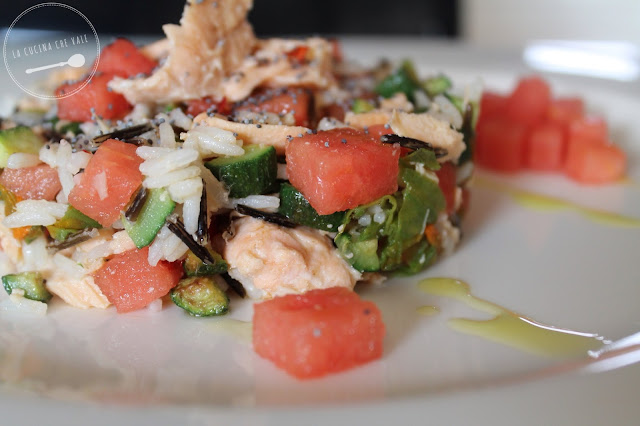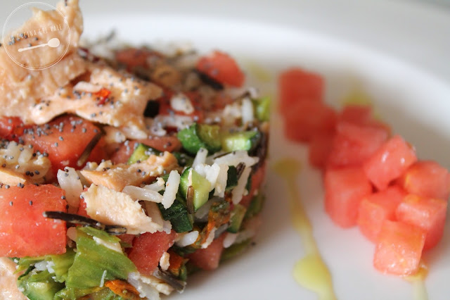 RISO SELVATICO CON SALMONE AFFUMICATO, ZUCCHINETTE E FIORI, ANGURIA E PEPERONCINO