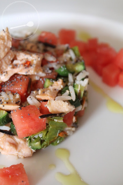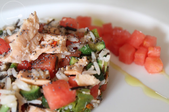 Condite il riso freddo con il salmone affumicato e le zucchinette, regolate di sale e olio e aggiungete poco peperoncino, alla fine aggiungete anche l’anguria e servite subito spolverando con semi di papavero.