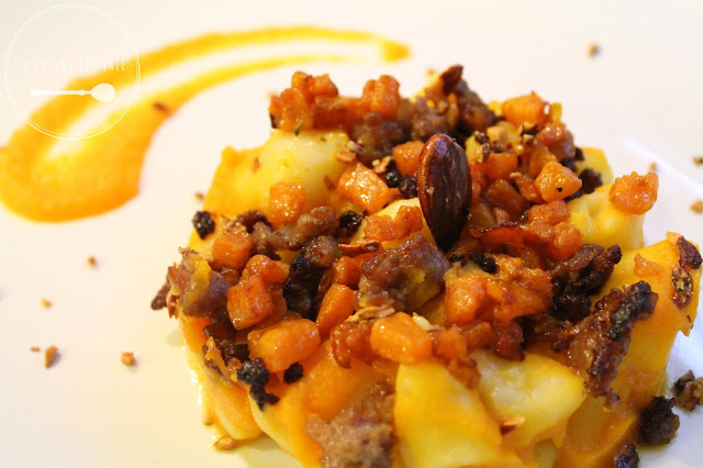 GNOCCHI DI PATATE, CREMA DI ZUCCA, BRICIOLE DI SALSICCIA CROCCANTE, MANDORLE SPEZIATE