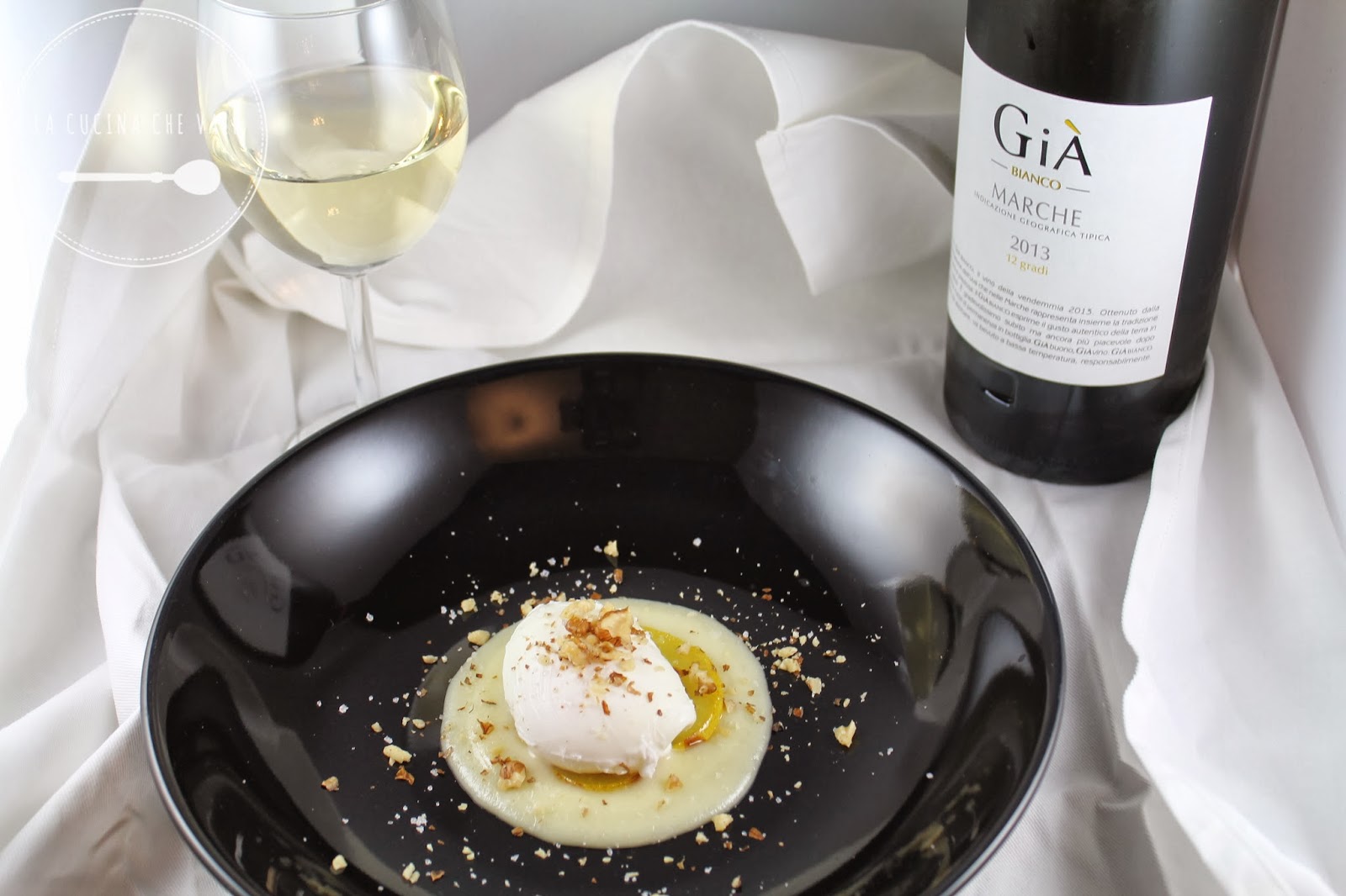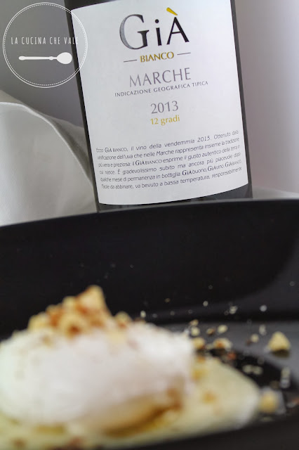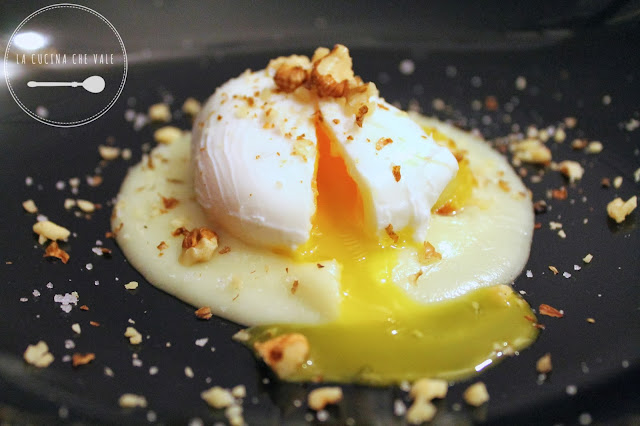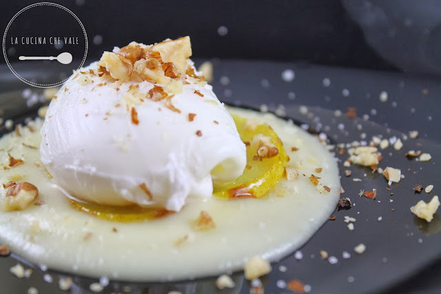 UOVO POCHE’, CREMA DI TALEGGIO, PERA CARAMELLATA AL GIA’ BIANCO, NOCI CROCCANTI